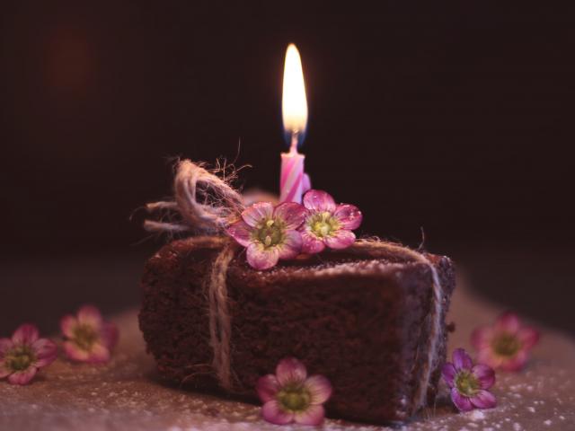 Обои Кусок торта на столе с розовыми цветами и свечкой
