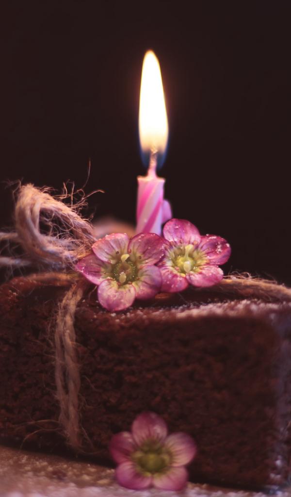 Обои Кусок торта на столе с розовыми цветами и свечкой
