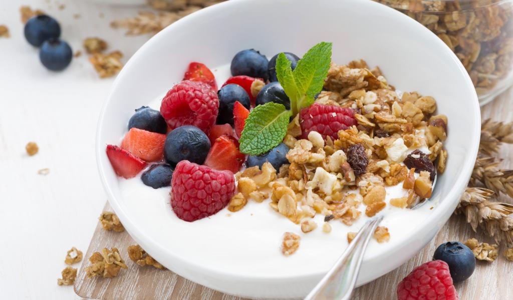 Обои Овсяные хлопья со свежими ягодами и йогуртом на завтрак