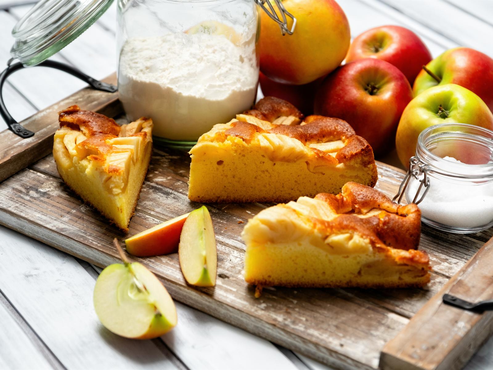 Обои Куски пирога на столе с яблоками и мукой