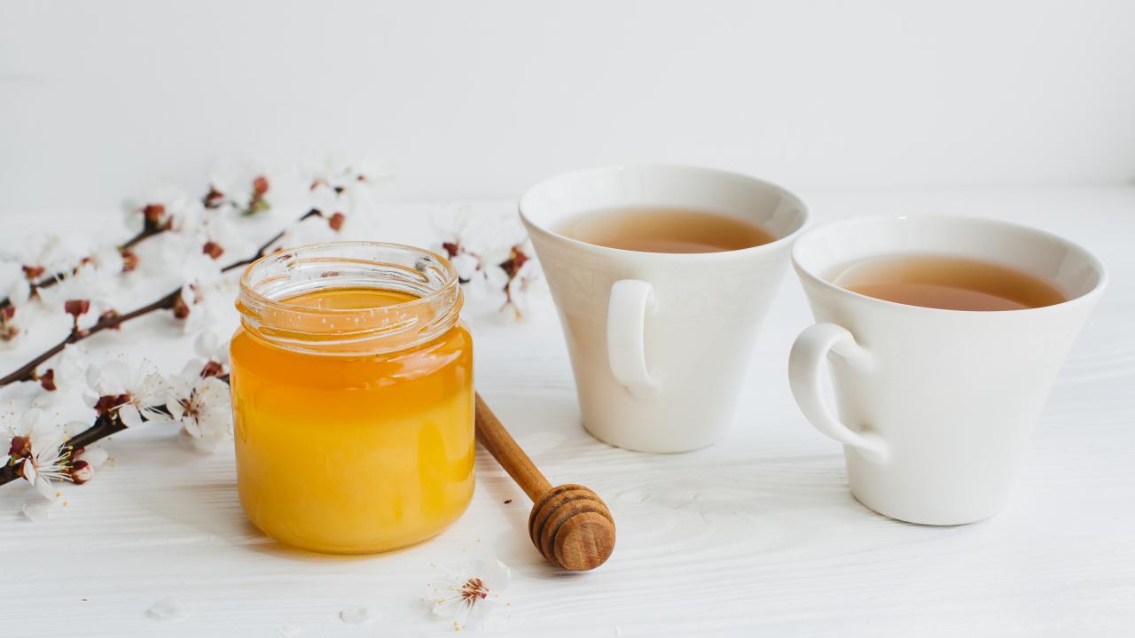 Обои Мед на столе с чаем и цветами абрикоса