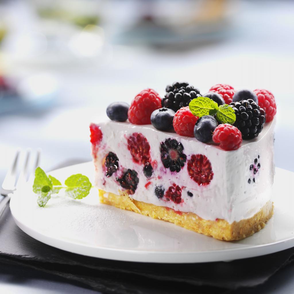 Обои Аппетитный торт-суфле с ягодами на белой тарелке