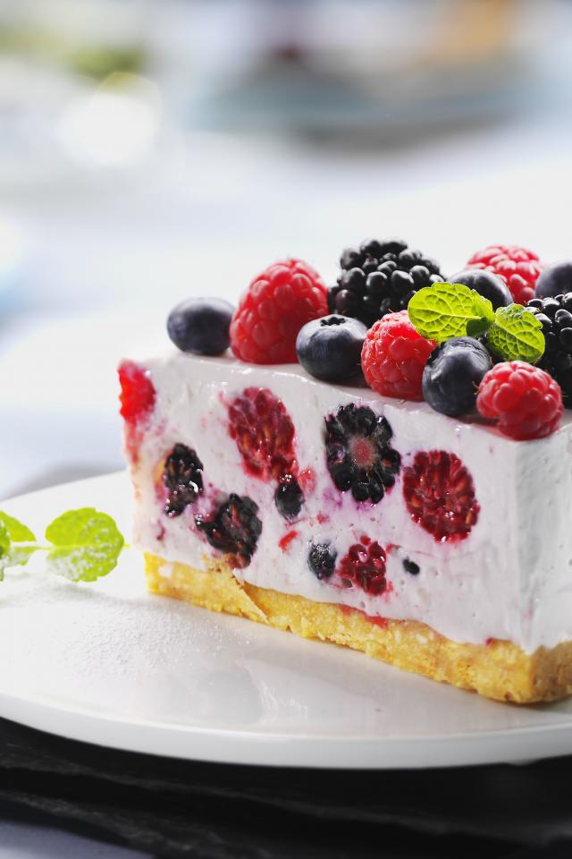 Обои Аппетитный торт-суфле с ягодами на белой тарелке