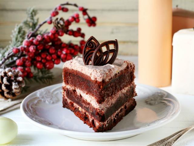 Обои Кусок шоколадного торта на белой тарелке на столе