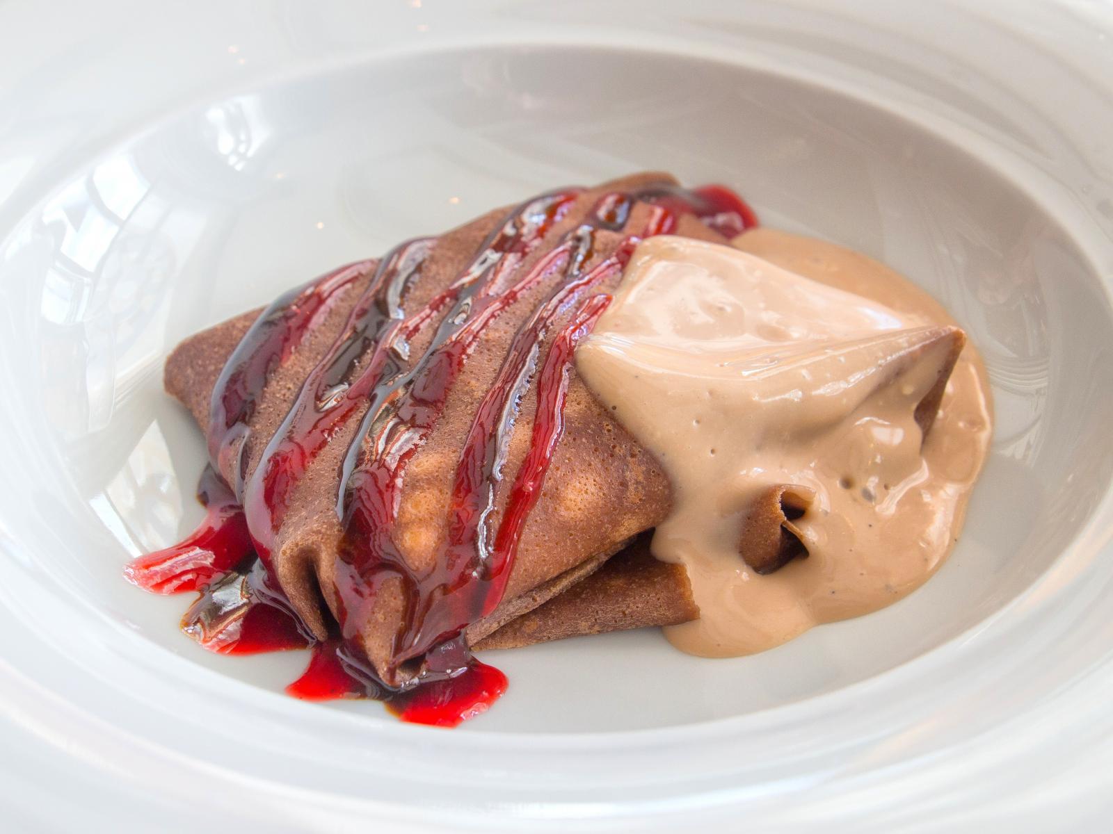 Обои Блинчик с джемом и йогуртом в белой тарелке