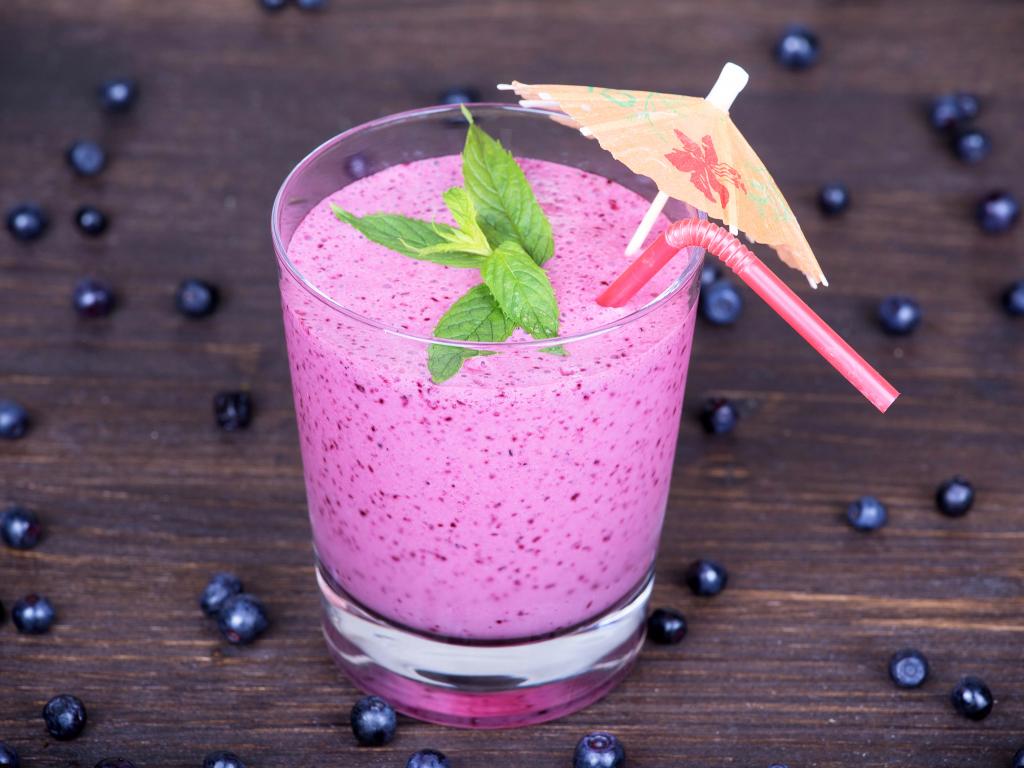 Обои Черничный смузи на столе со свежими ягодами и трубочками