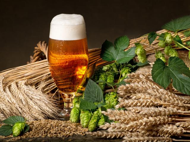 Обои Бокал пива с хмелем и колосьями пшеницы