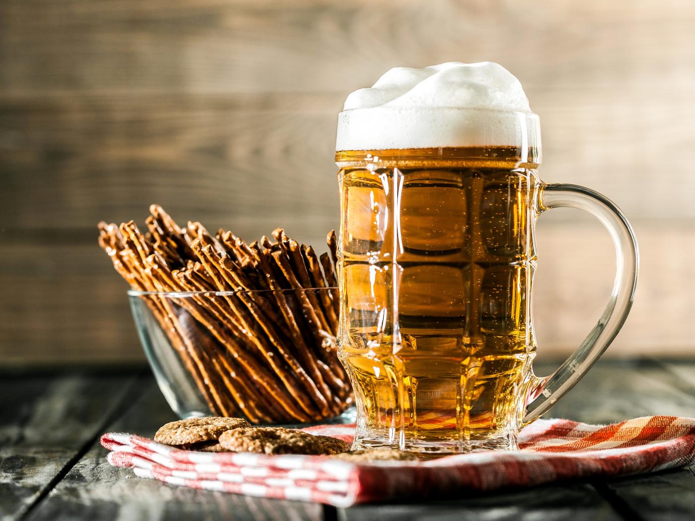 Обои Бокал свежего пива с выпечкой на столе