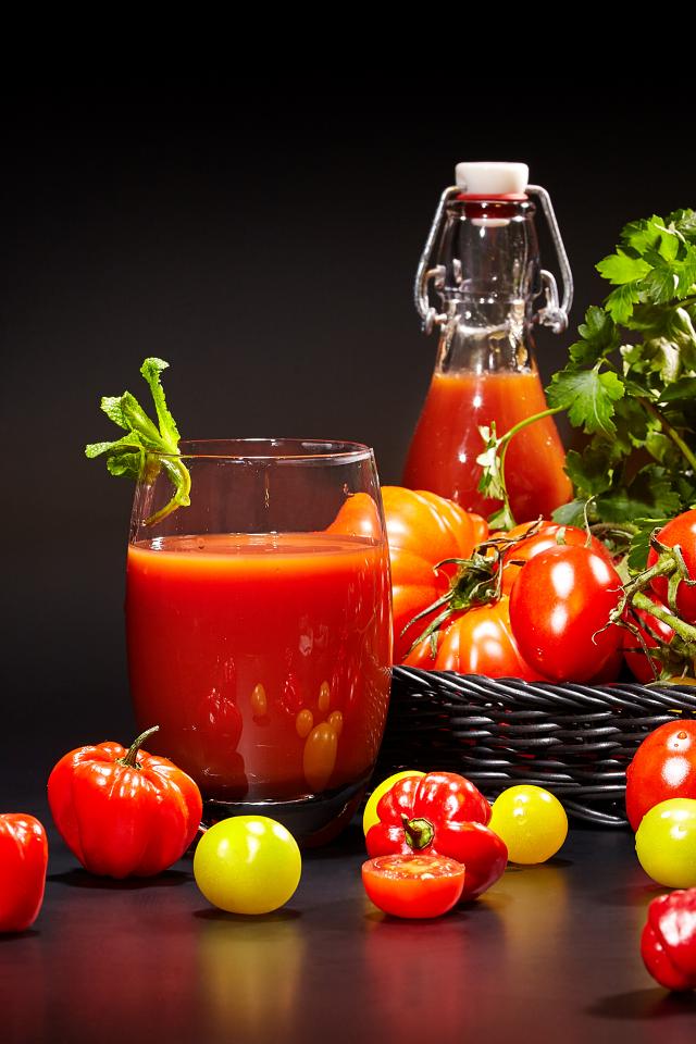 Обои Томатный сок и свежие помидоры на столе на черном фоне
