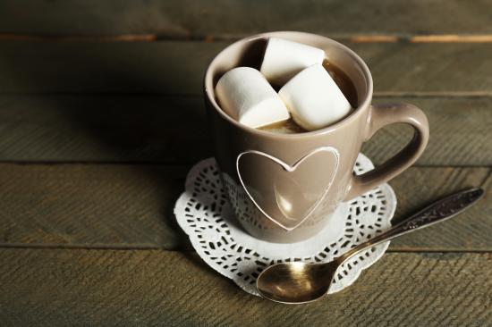Обои Чашка какао с кусочками маршмеллоу на кружевной салфетке