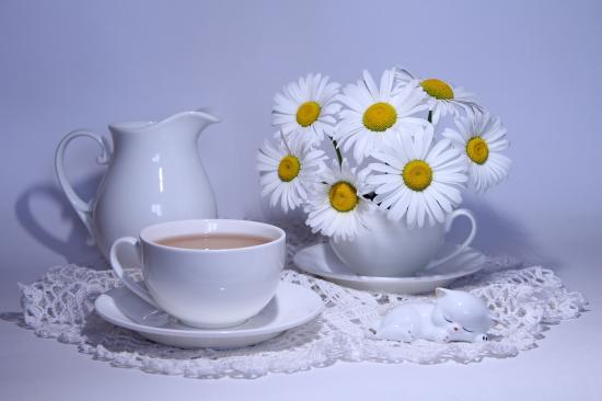 Обои Белая чашка какао на столе с кувшином и белыми ромашками