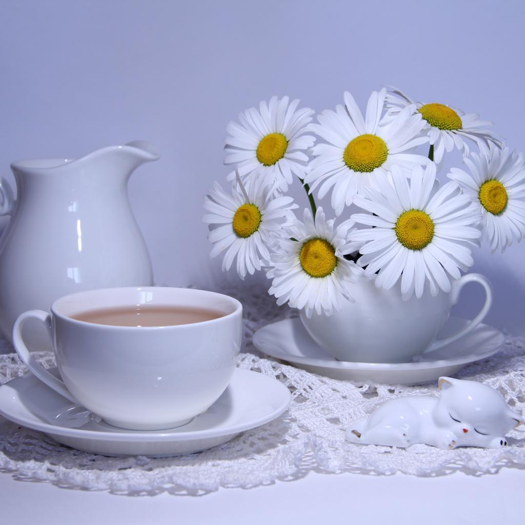 Обои Белая чашка какао на столе с кувшином и белыми ромашками