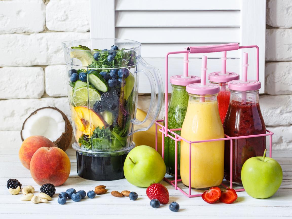 Обои Вкусный напиток смузи в бутылках на столе