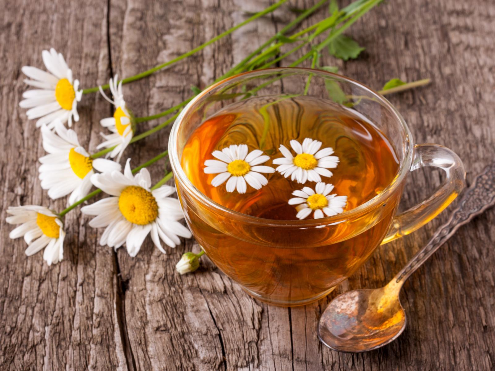 Обои Стеклянная чашка чая с ромашкой