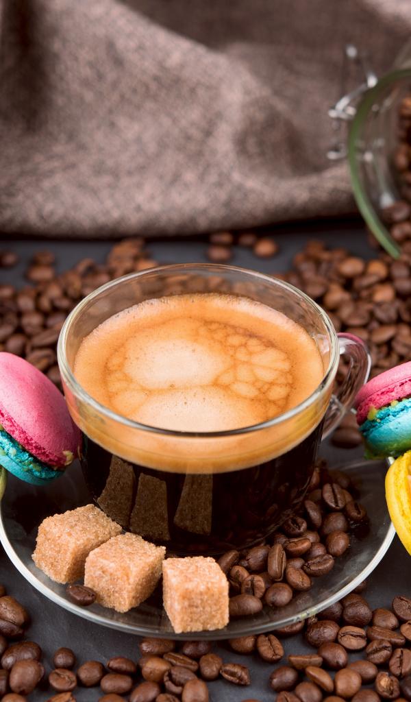 Обои Чашка кофе с кофейными зернами, кубиками сахара и десертом макарон