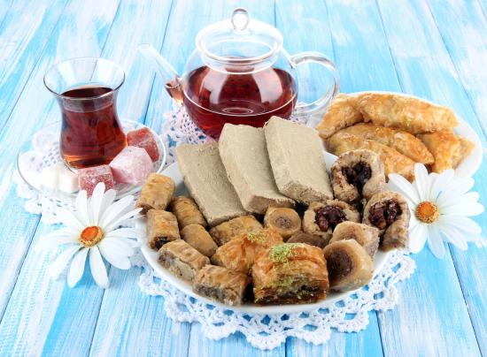 Обои Ароматный чай на столе с восточными сладостями