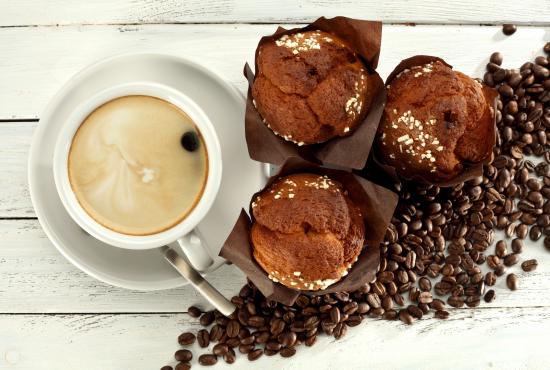 Обои Чашка кофе с кексами и кофейными зернами на столе