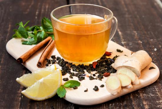 Обои Чай с имбирем, лимоном, корицей и мятой на разделочной доске