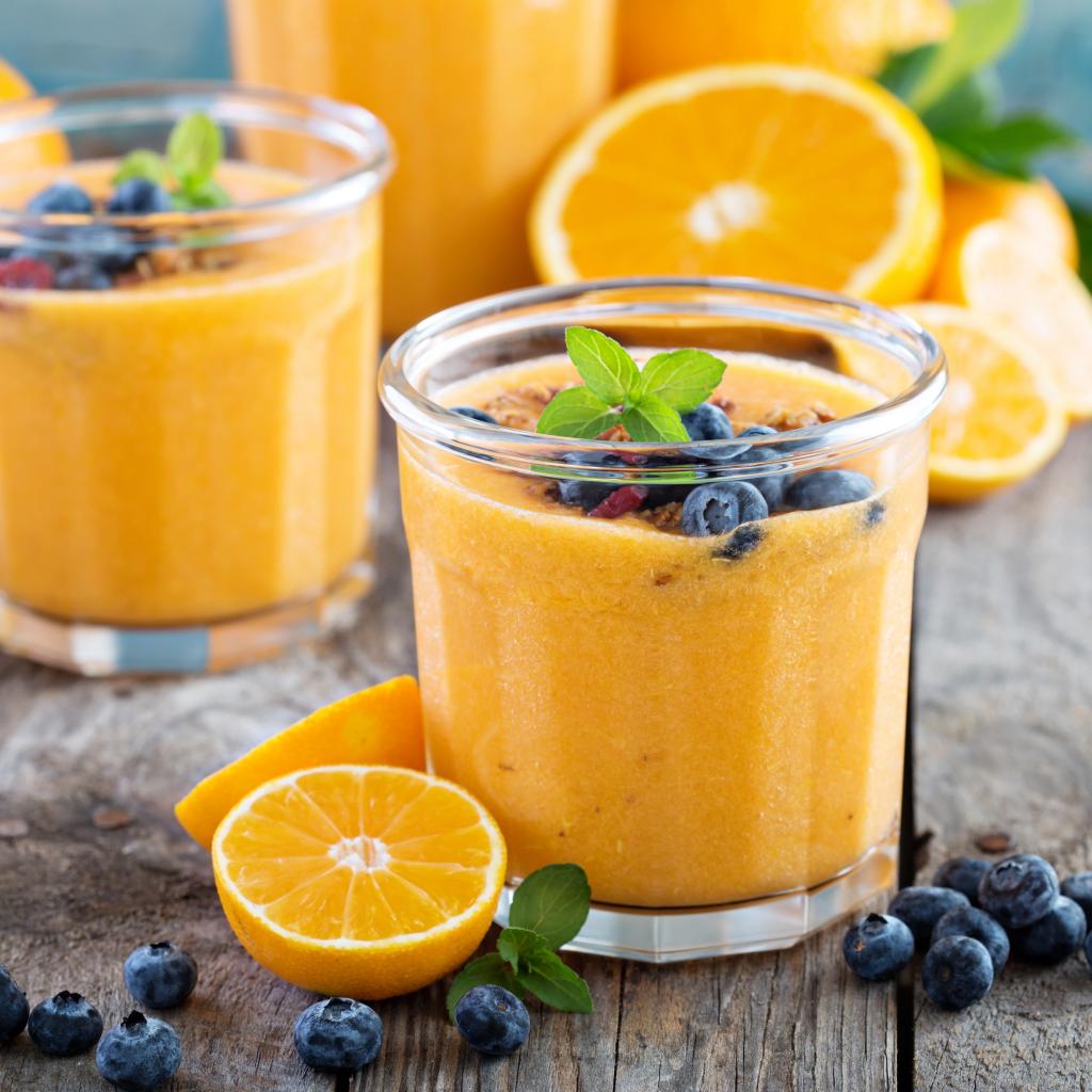 Обои Апельсиновый сок в стакане с ягодами черники