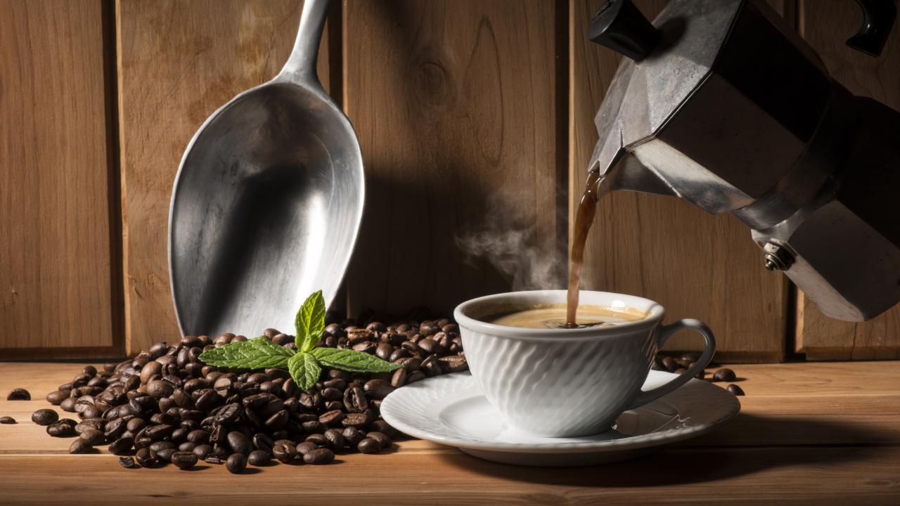 Обои Горячий кофе наливают в чашку на столе с кофейными зернами
