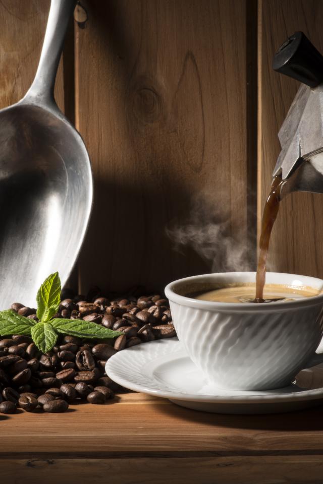 Обои Горячий кофе наливают в чашку на столе с кофейными зернами