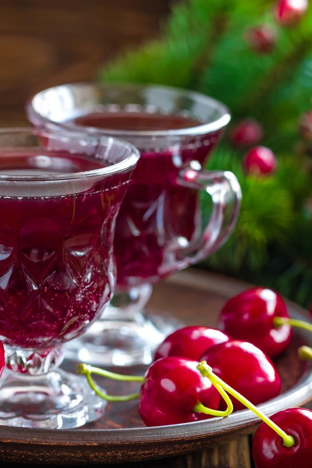 Обои Две чашки вишневого сока со свежими вишнями на столе