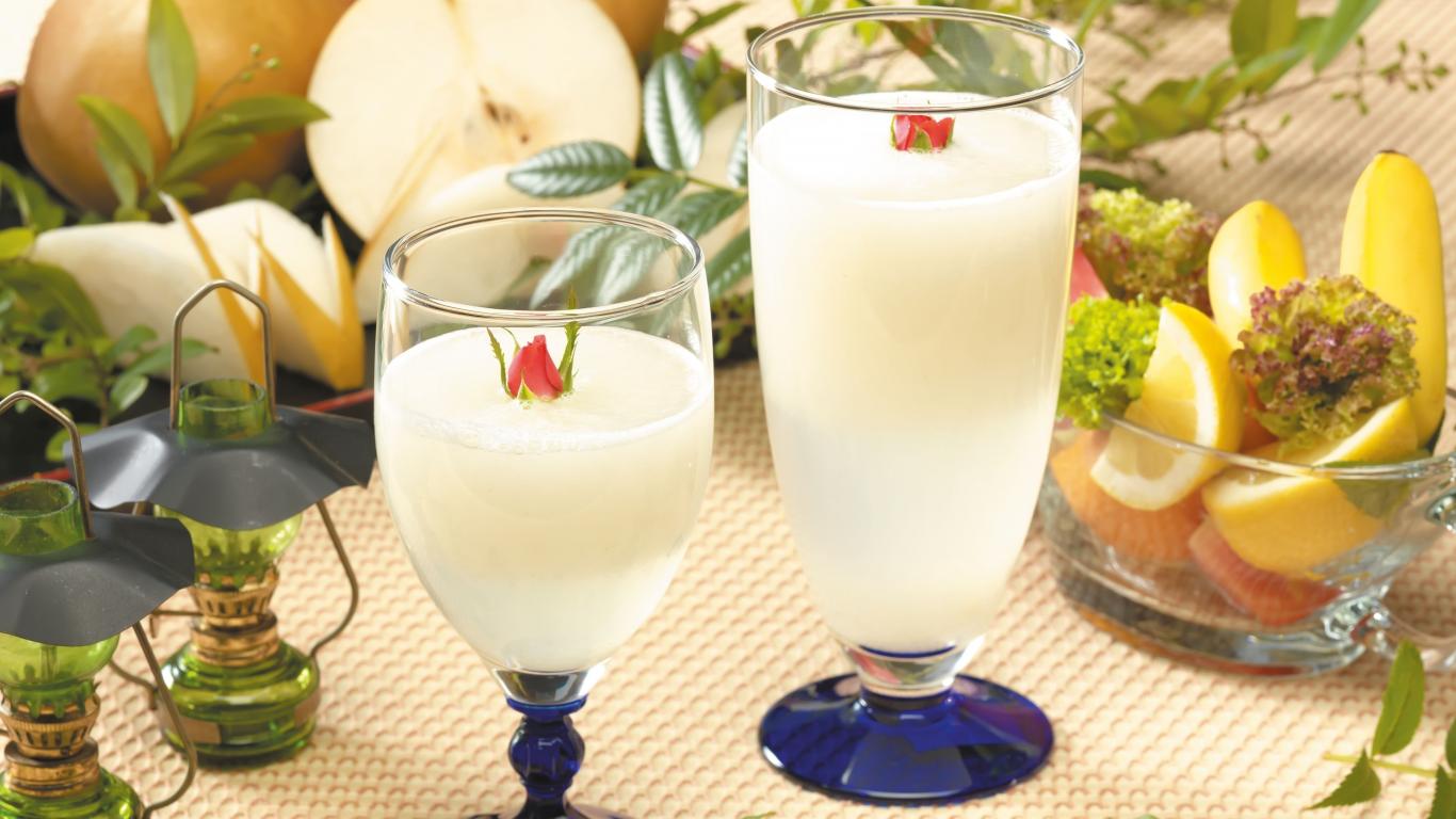 Обои Три бокала сока на столе с яблоками и апельсинами на белом фоне