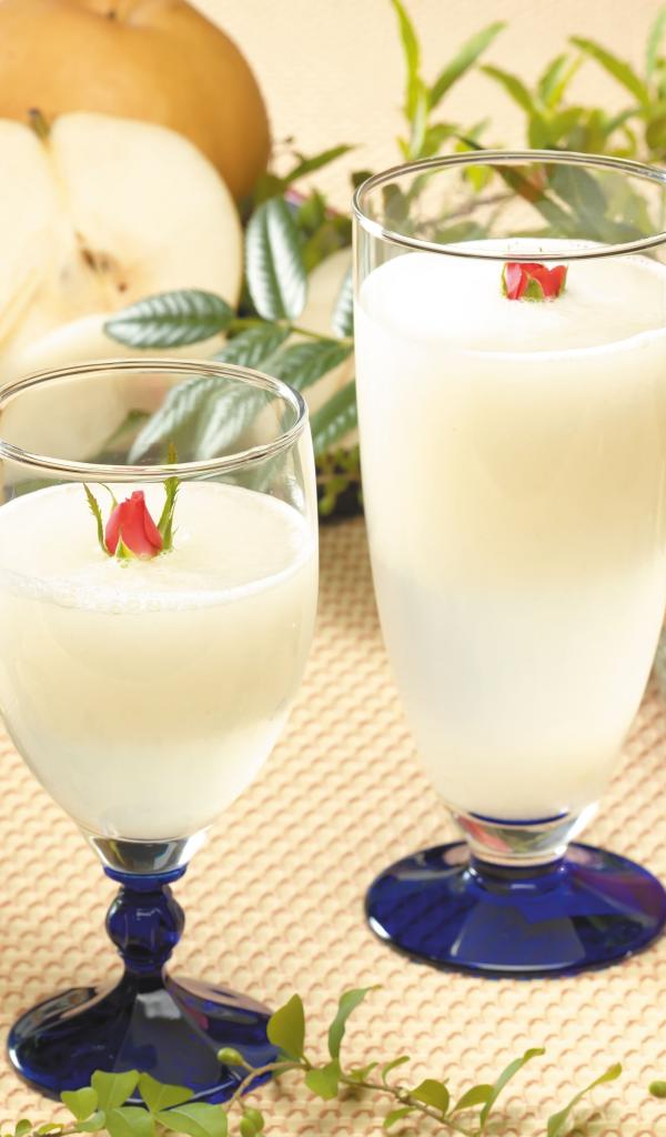 Обои Три бокала сока на столе с яблоками и апельсинами на белом фоне