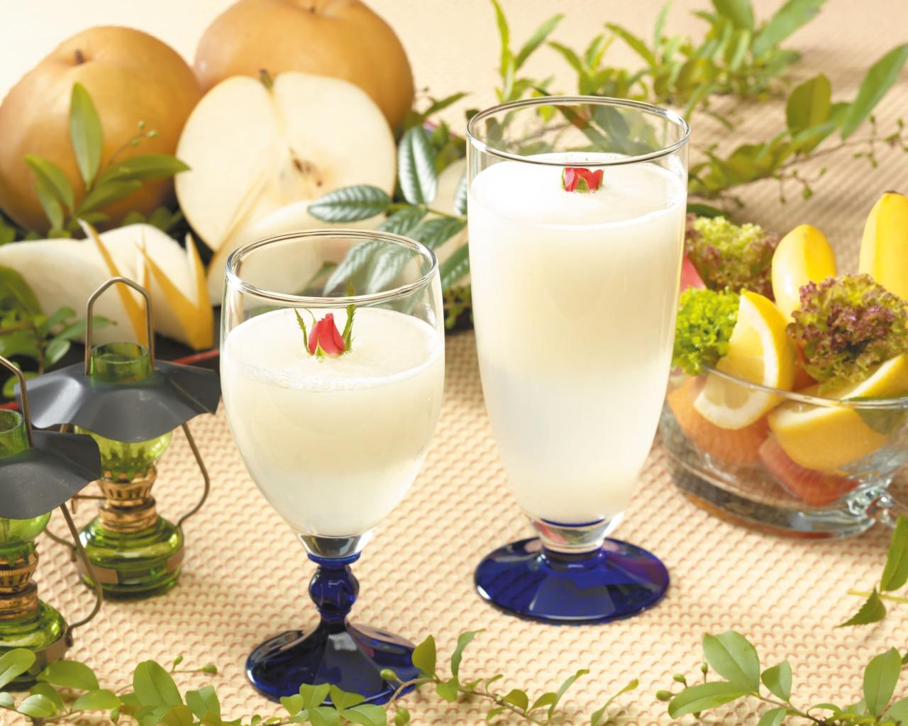 Обои Три бокала сока на столе с яблоками и апельсинами на белом фоне