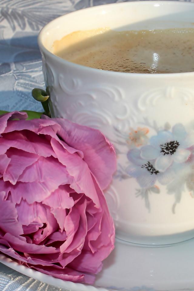 Обои Чашка кофе с розовым цветком пиона и белыми цветами