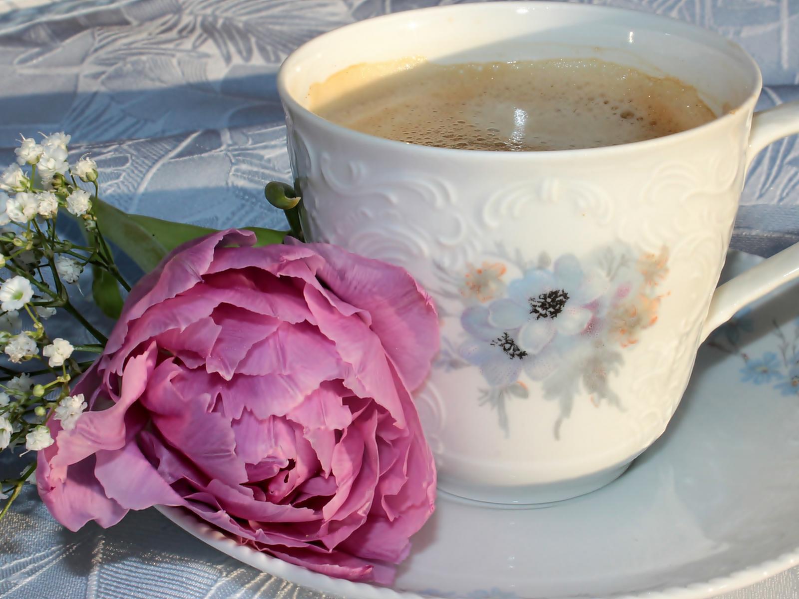 Обои Чашка кофе с розовым цветком пиона и белыми цветами