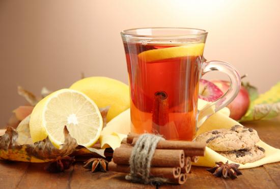 Обои Чашка чая с лимоном и корицей на столе с лимонами