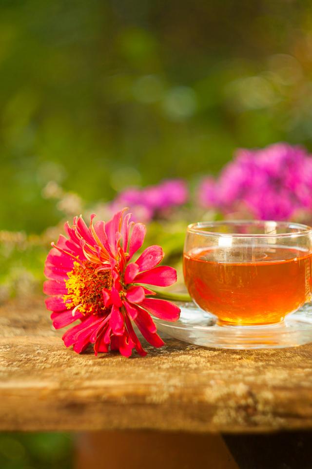 Обои Стеклянная чашка чая на столе с цветком циннии