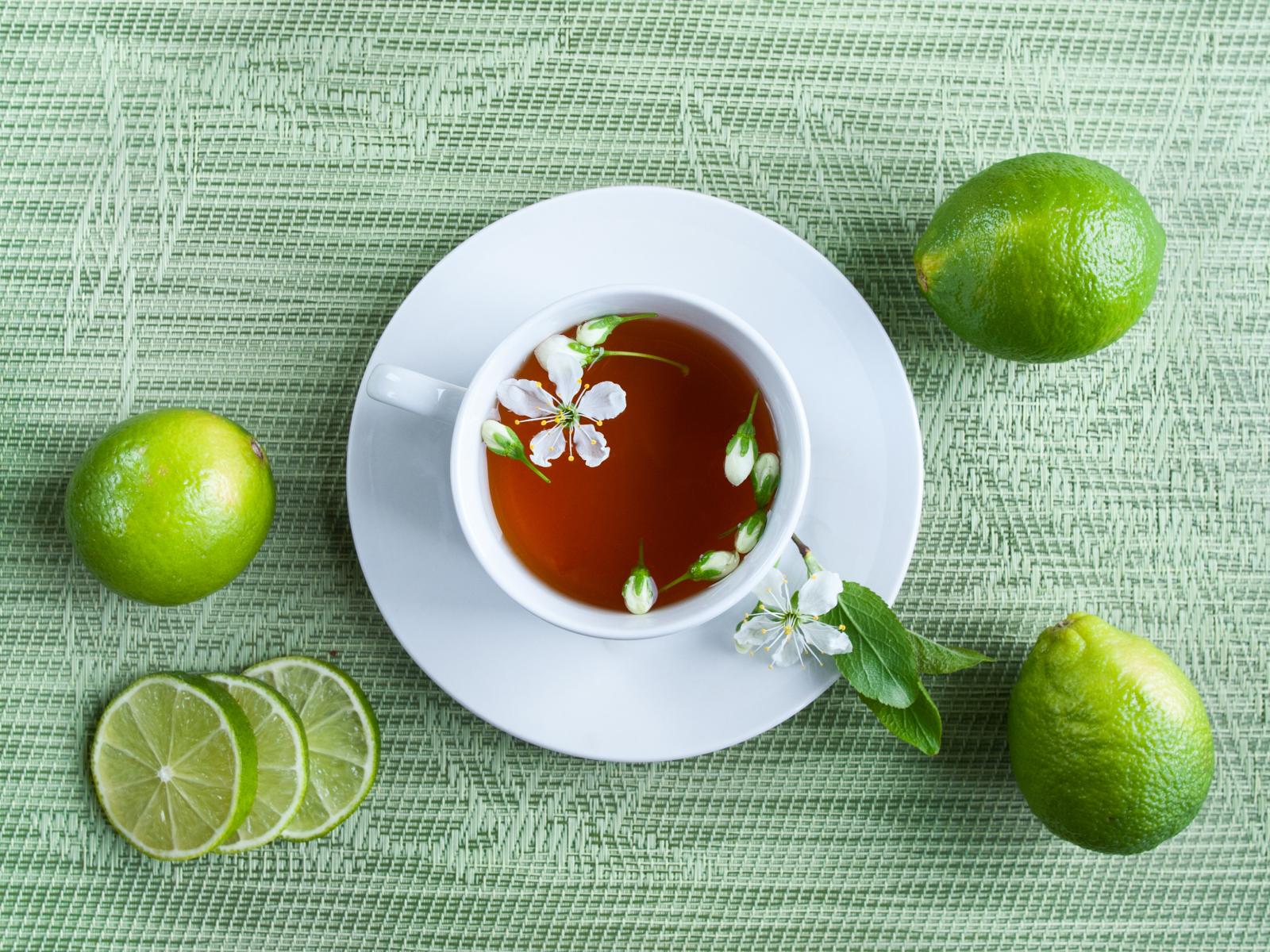 Обои Чашка чая с зелеными лаймами на столе