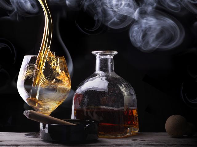 Обои Виски в бокале на столе с бутылкой и сигарой