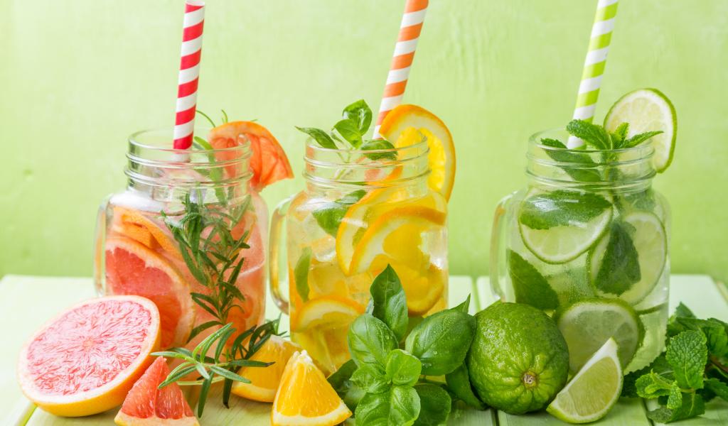 Обои Цитрусовые коктейли в баночках с трубочками