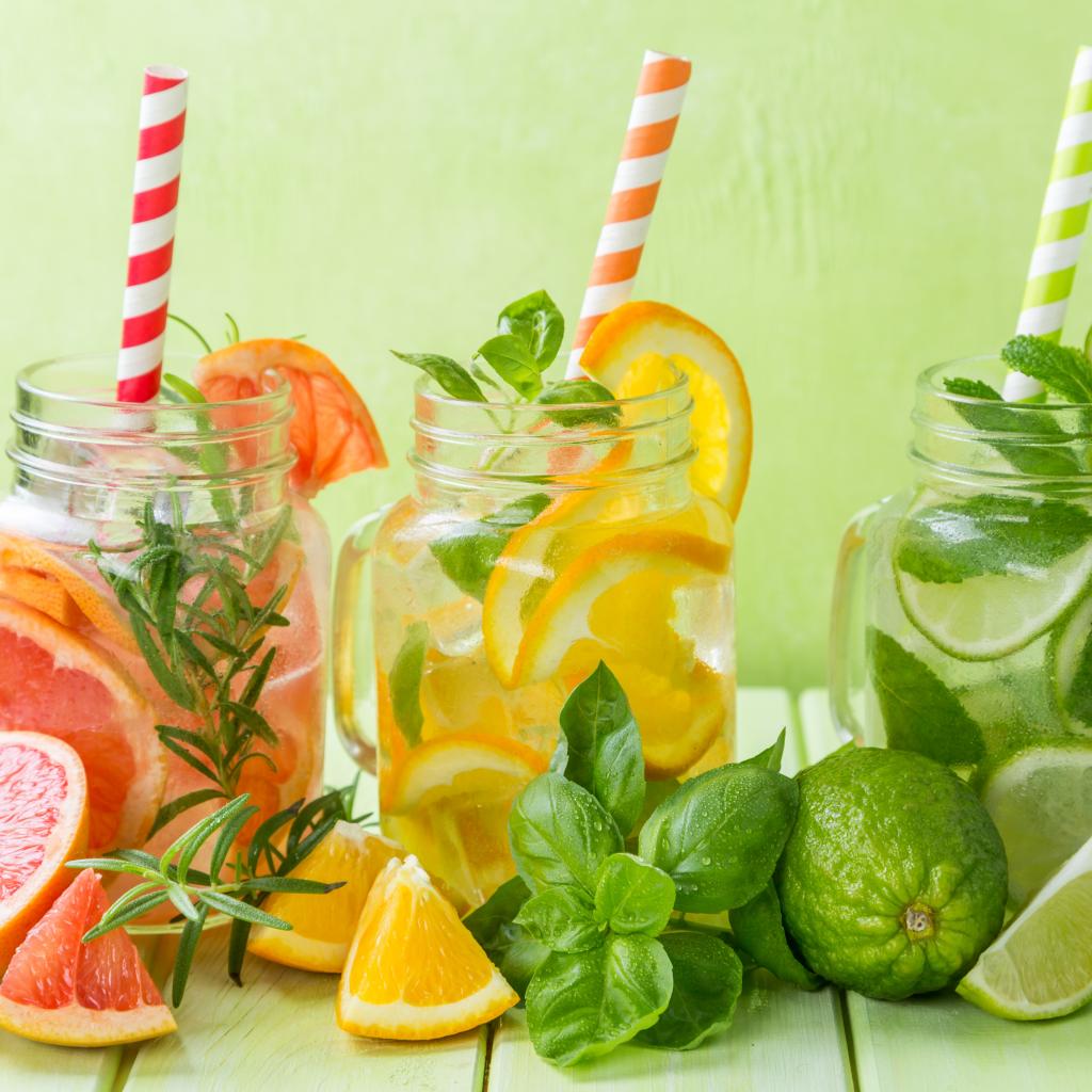 Обои Цитрусовые коктейли в баночках с трубочками