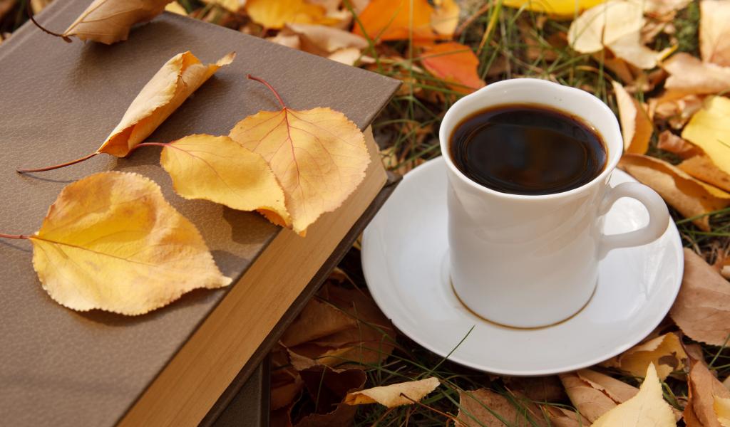 Обои Белая чашка кофе с книгой на сухой листве осенью