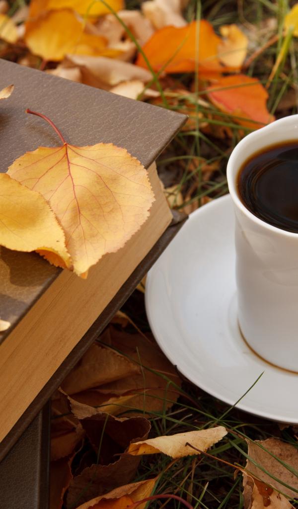 Обои Белая чашка кофе с книгой на сухой листве осенью