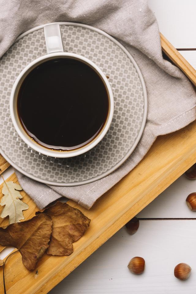 Обои Чашка кофе на столе с лесными орехами и желтыми листьями