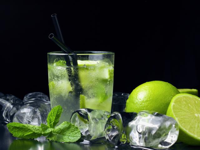 Обои Коктейль мохито на черном фоне с лаймом и кубиками льда