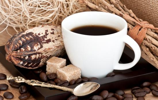 Обои Белая чашка кофе с зернами и кусочками сахара на столе