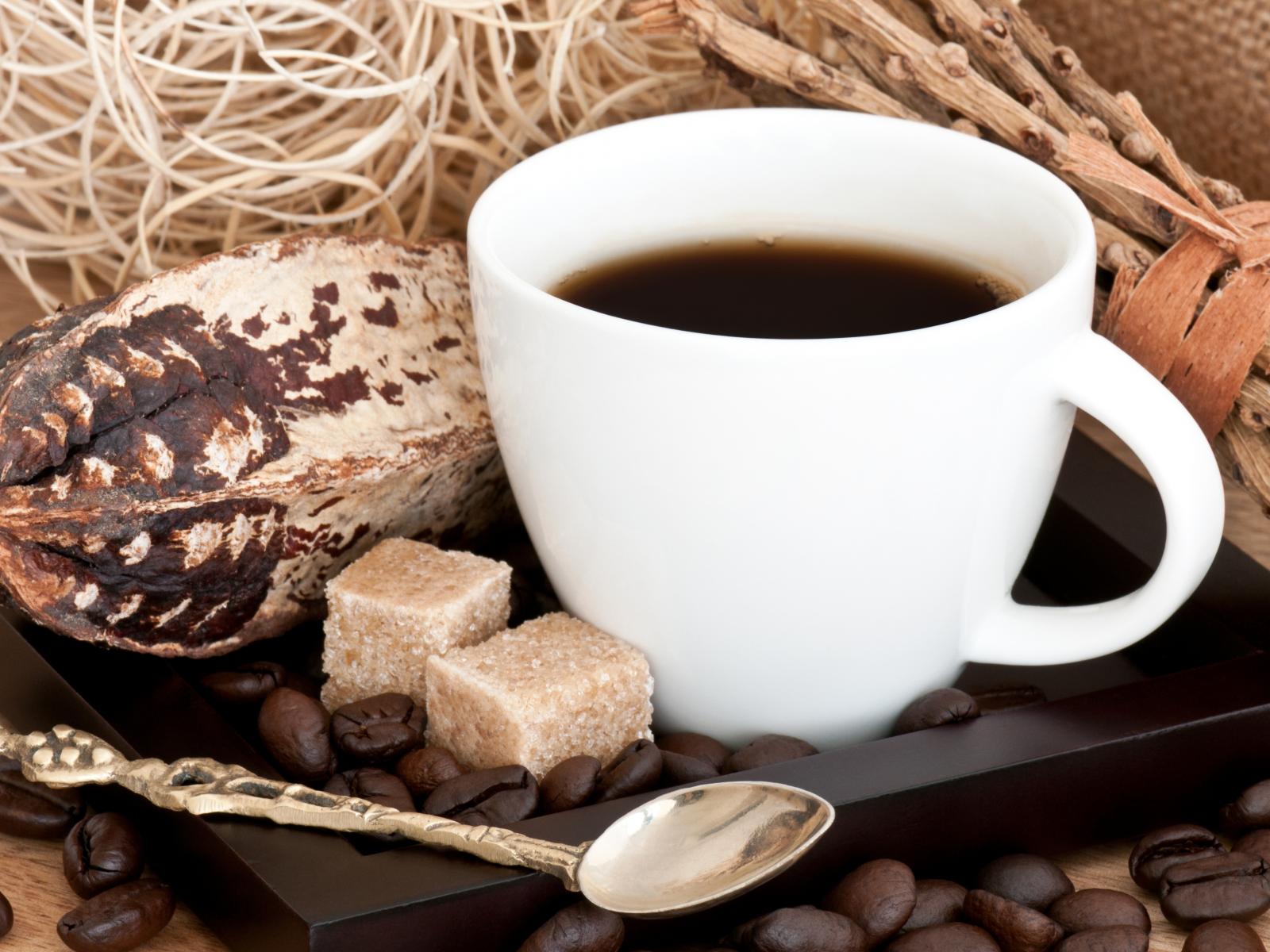 Обои Белая чашка кофе с зернами и кусочками сахара на столе