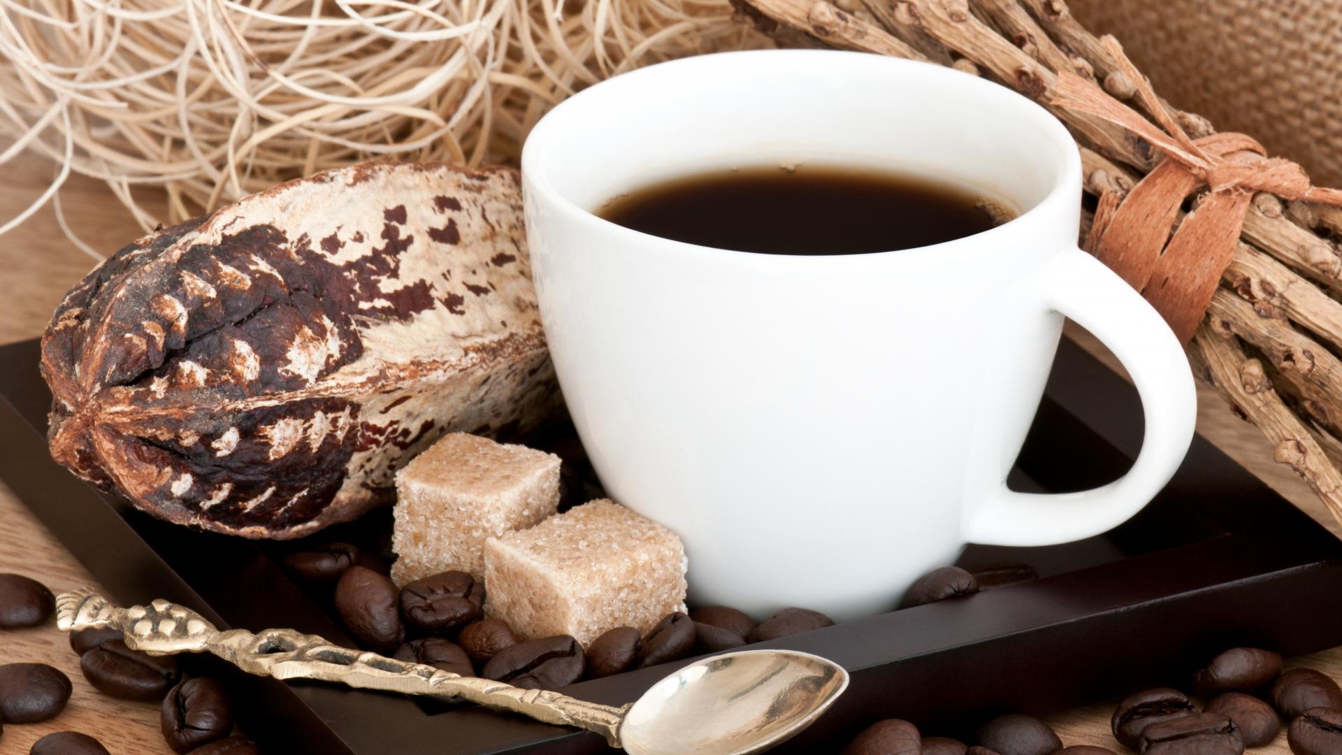 Обои Белая чашка кофе с зернами и кусочками сахара на столе