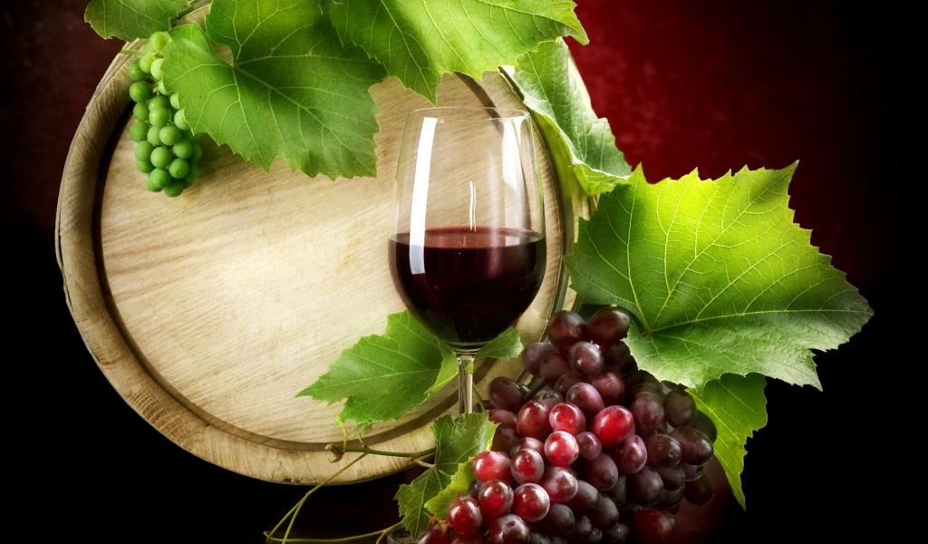 Обои Бокал вина на столе с гроздью винограда и бочкой