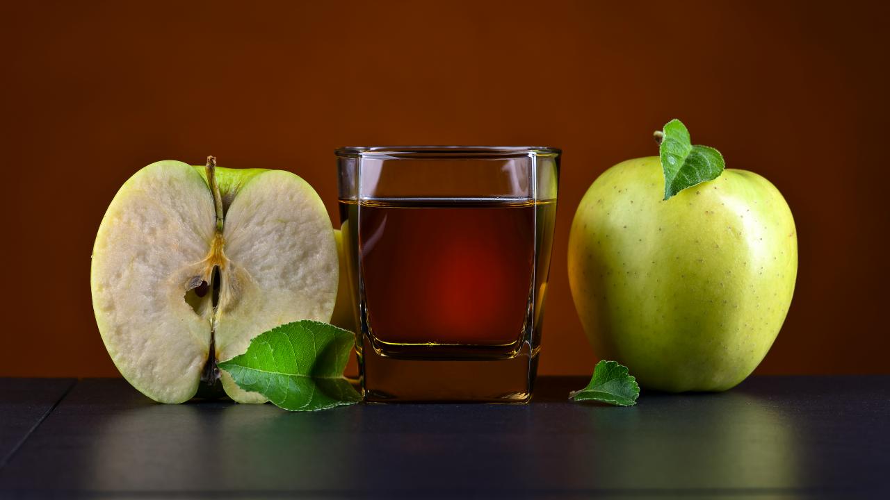 Обои Стакан яблочного сока на столе с зелеными яблоками