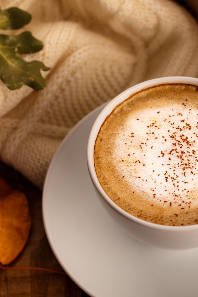 Обои Белая чашка с вкусным кофе на столе с желтыми листьями