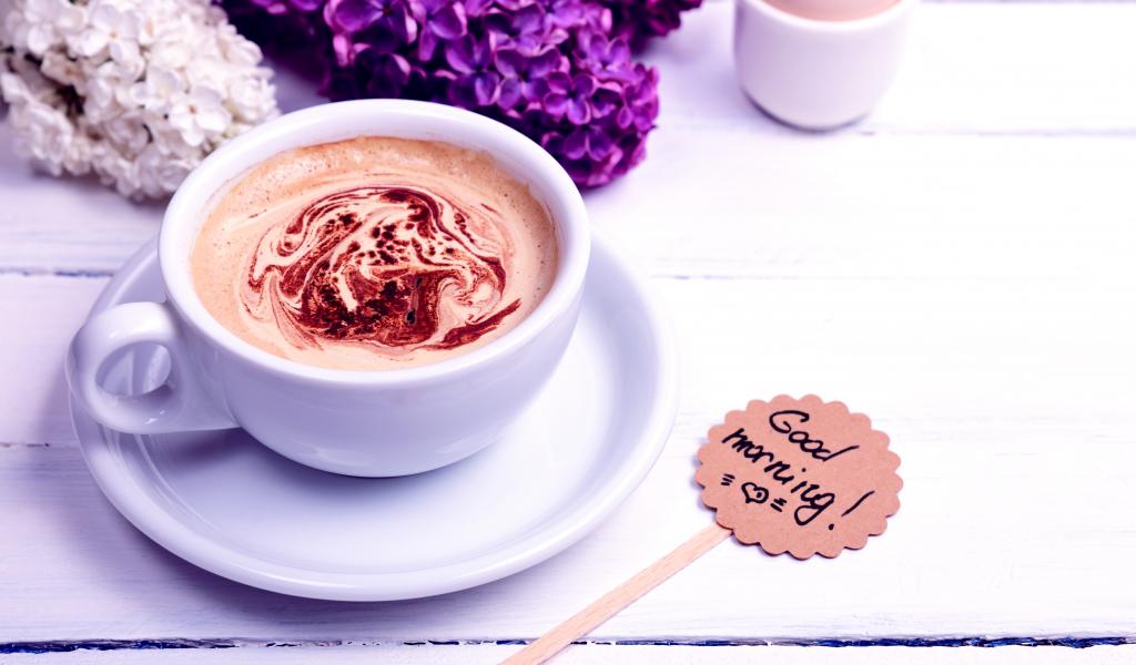 Обои Белая чашка кофе с цветами сирени и яйцом на завтрак