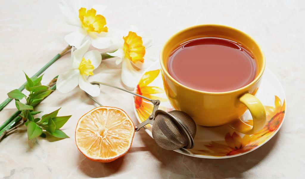 Обои Чашка чаю на столе с лимоном и цветами нарцисса