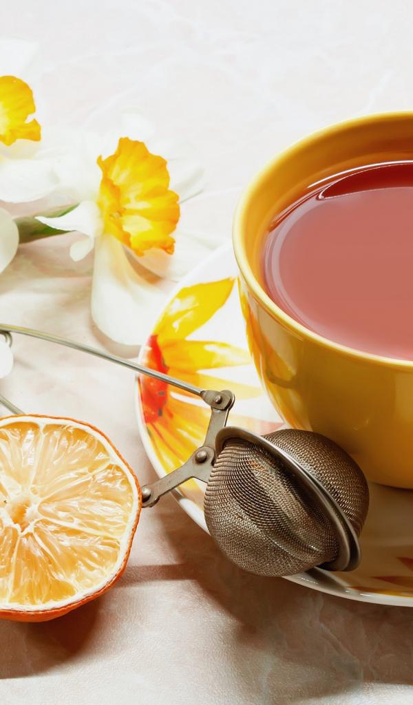 Обои Чашка чаю на столе с лимоном и цветами нарцисса